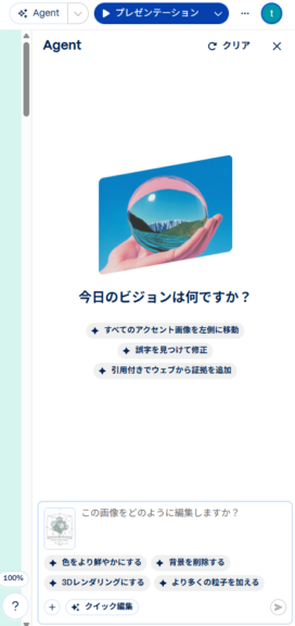 生成されたプレゼンテーションの確認画面でAgentという選択肢があって、そこからGitHub Copilotのように対話形式で修正できるようでした。