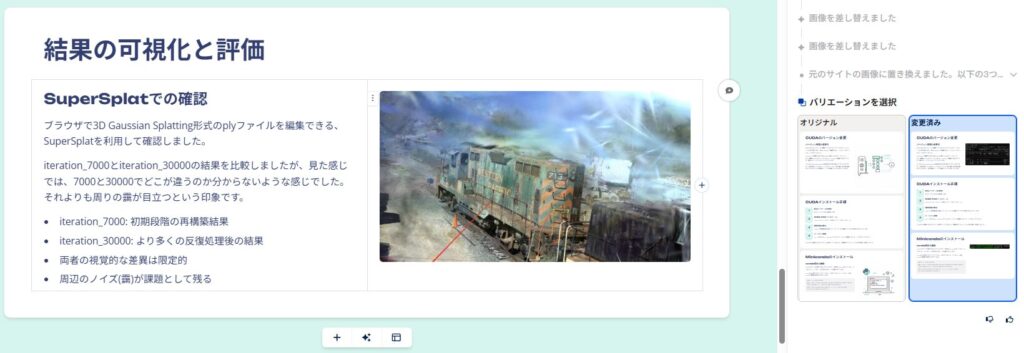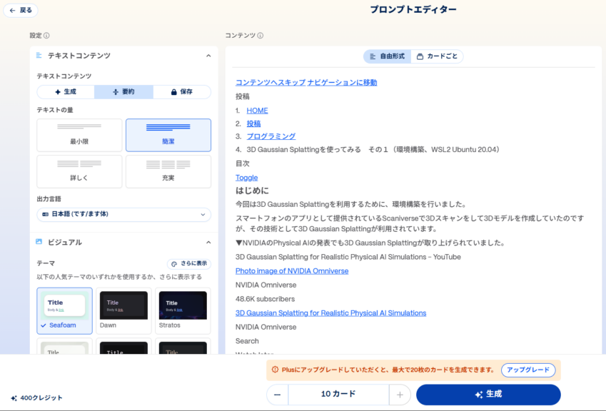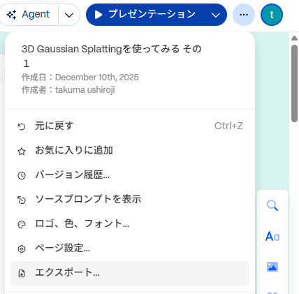 サイトのURLから生成できるということだったので、過去の3D Gaussian Splattingの環境構築に関する記事をもとに生成してもらいました。