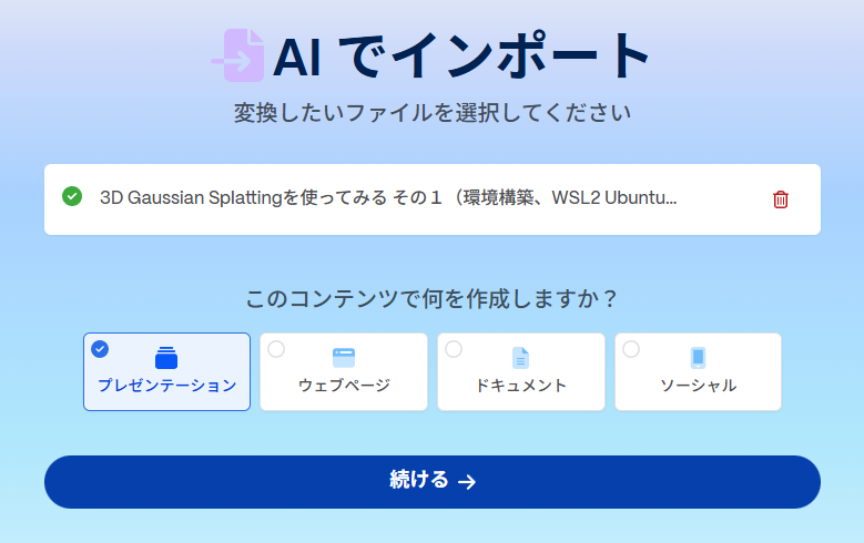 早速GAMMAのページでプレゼンテーションの作成に進みました。