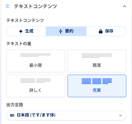 ▼テキストコンテンツではテキストの量や言語を選べます。
