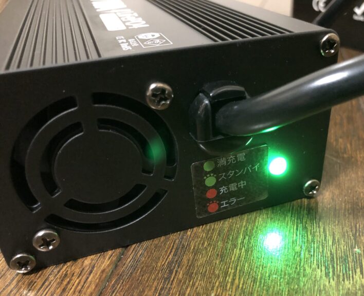 最初電圧をテスターで測ったときは13.16Vだったので、だいたい50%ぐらいは充電されているようでした。作成したコネクタと充電器で充電してみます。