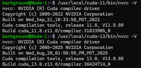 なおcuda-11.8、cuda-13.0にもnvccは入っており、直接パスを指定するとそのバージョンが表示されました。
