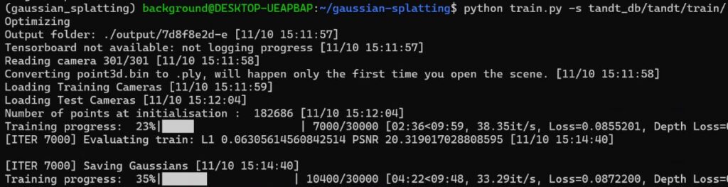 python train.py -s tandt_db/tandt/train/▼処理が始まりました。7000と30000があるようです。