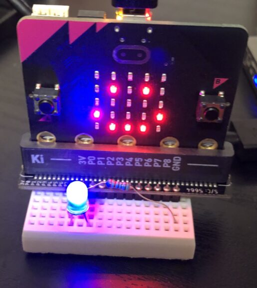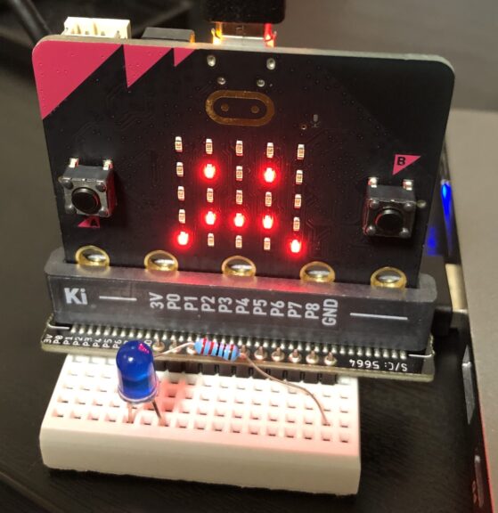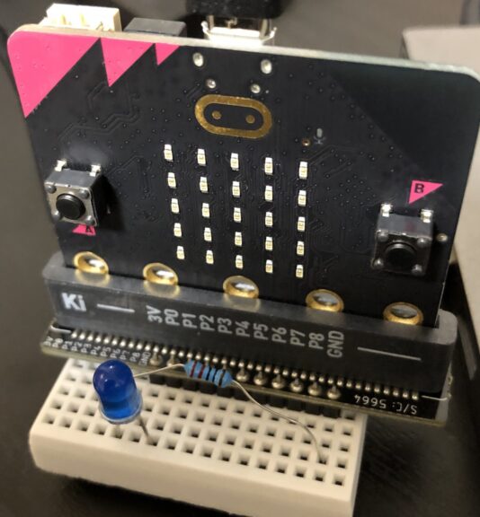 micro:bitのP0ピンにLEDを接続して、プログラムで制御してみます。マイコン関連でプログラムするときは、LEDをチカチカさせる「Lチカ」からはじめることが多いです。