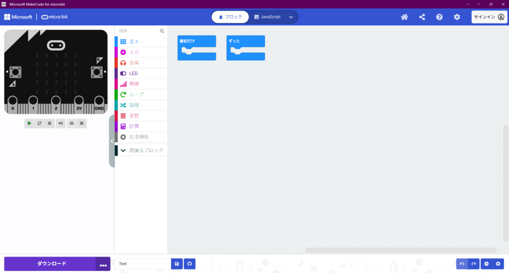 「最初だけ」と「ずっと」というブロックがあるのは、Arduino IDEで開発するときのsetup()とloop()に相通ずるものがあるように思います。Make Codeの拡張機能も試していきたいところです。