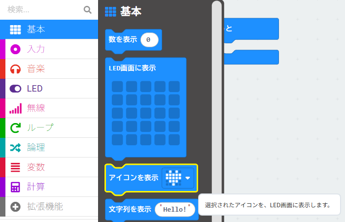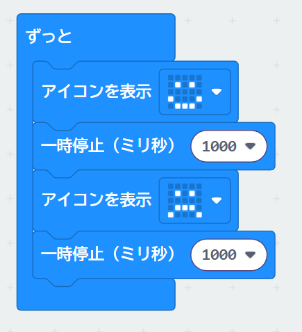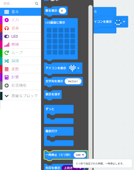 ▼基本のブロックからアイコンを表示するものと、一時停止するものを利用します。