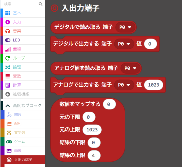 ▼高度なブロックの中に、ピンの制御に関するブロックがあります。