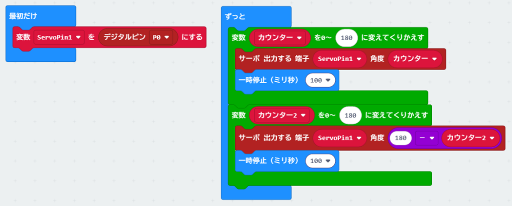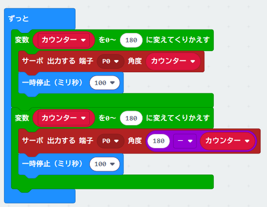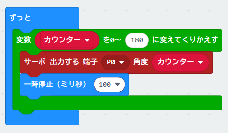 カウンターという変数の値を0から180まで変化するようにして、その値を先程のサーボブロックの角度に入れます。