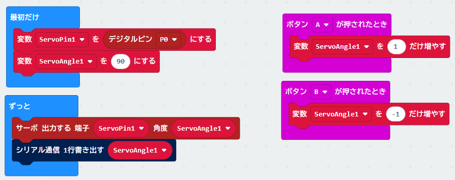 ブロックと変数でサーボモータの角度を制御できることを確認できました。