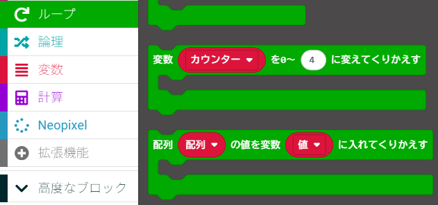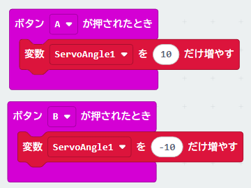 ▼ServoAngle1という変数を追加しました。変数の値を増やすブロックも用います。