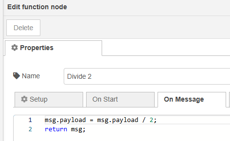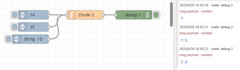 [{"id":"81a12d3049d365d4","type":"function","z":"41ad2b666875c180","name":"Divide 2","func":"msg.payload = msg.payload / 2;\nreturn msg;","outputs":1,"timeout":0,"noerr":0,"initialize":"","finalize":"","libs":[],"x":1580,"y":320,"wires":[["b2165721a63384e5"]]},{"id":"ccf337e61eda628a","type":"inject","z":"41ad2b666875c180","name":"","props":[{"p":"payload"}],"repeat":"","crontab":"","once":false,"onceDelay":0.1,"topic":"","payload":"14","payloadType":"num","x":1410,"y":320,"wires":[["81a12d3049d365d4"]]},{"id":"f774e275edc23f99","type":"inject","z":"41ad2b666875c180","name":"","props":[{"p":"payload"}],"repeat":"","crontab":"","once":false,"onceDelay":0.1,"topic":"","payload":"15","payloadType":"num","x":1410,"y":360,"wires":[["81a12d3049d365d4"]]},{"id":"6f084383639b8554","type":"inject","z":"41ad2b666875c180","name":"String: 15","props":[{"p":"payload"}],"repeat":"","crontab":"","once":false,"onceDelay":0.1,"topic":"","payload":"15","payloadType":"str","x":1400,"y":400,"wires":[["81a12d3049d365d4"]]},{"id":"b2165721a63384e5","type":"debug","z":"41ad2b666875c180","name":"debug 2","active":true,"tosidebar":true,"console":false,"tostatus":false,"complete":"false","statusVal":"","statusType":"auto","x":1740,"y":320,"wires":[]}]