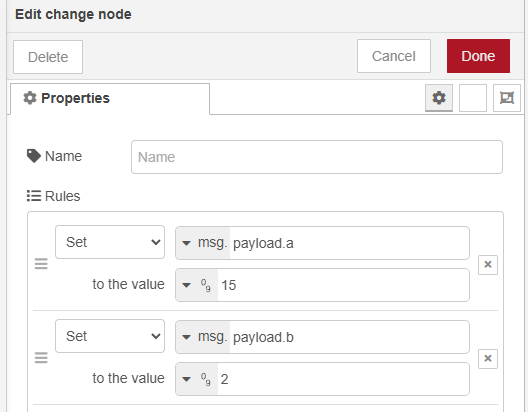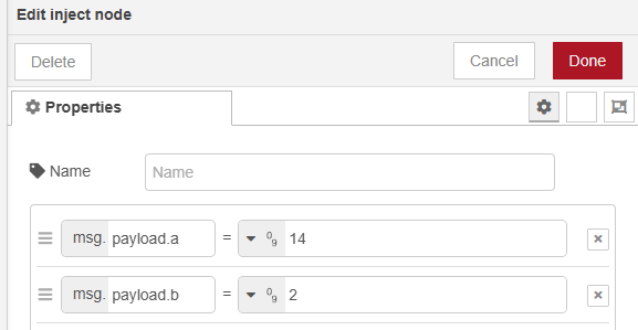 injectノードやchangeノードでmsg.payload以外に、msg.payload.a、msg.payload.bに代入しても計算できます。