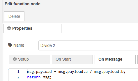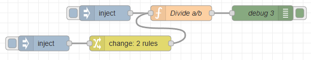 [{"id":"55043a16b675521b","type":"inject","z":"41ad2b666875c180","name":"","props":[{"p":"payload.a","v":"14","vt":"num"},{"p":"payload.b","v":"2","vt":"num"}],"repeat":"","crontab":"","once":false,"onceDelay":0.1,"topic":"","x":1410,"y":500,"wires":[["55be71db93b9db6f"]]},{"id":"55be71db93b9db6f","type":"function","z":"41ad2b666875c180","name":"Divide a/b","func":"msg.payload = msg.payload.a / msg.payload.b;\nreturn msg;","outputs":1,"timeout":0,"noerr":0,"initialize":"","finalize":"","libs":[],"x":1560,"y":500,"wires":[["0f7f73fd3546014a"]]},{"id":"0f7f73fd3546014a","type":"debug","z":"41ad2b666875c180","name":"debug 3","active":true,"tosidebar":true,"console":false,"tostatus":false,"complete":"true","targetType":"full","statusVal":"","statusType":"auto","x":1720,"y":500,"wires":[]},{"id":"c0dec9c557a75115","type":"change","z":"41ad2b666875c180","name":"","rules":[{"t":"set","p":"payload.a","pt":"msg","to":"15","tot":"num"},{"t":"set","p":"payload.b","pt":"msg","to":"2","tot":"num"}],"action":"","property":"","from":"","to":"","reg":false,"x":1460,"y":560,"wires":[["55be71db93b9db6f"]]},{"id":"de9c343ebe00883f","type":"inject","z":"41ad2b666875c180","name":"","props":[],"repeat":"","crontab":"","once":false,"onceDelay":0.1,"topic":"","x":1290,"y":560,"wires":[["c0dec9c557a75115"]]}]