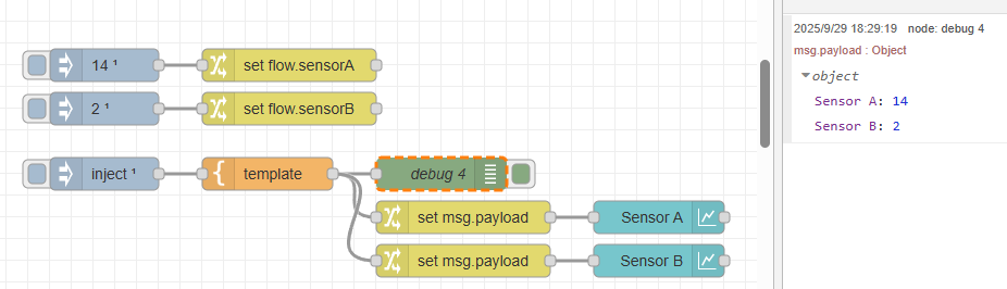 ▼flow.sensorAとflow.sensorBとして代入し、templateノードでその値を取得します。