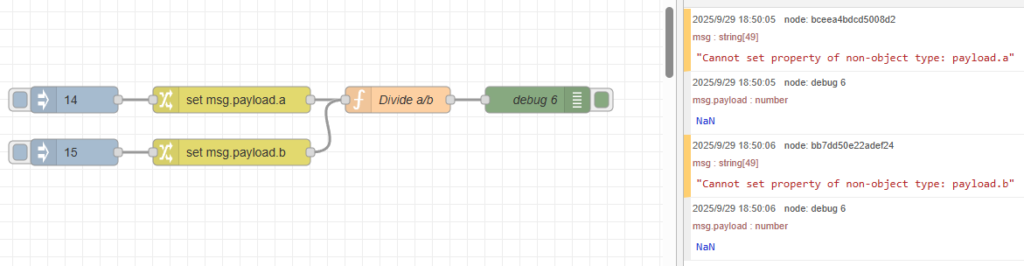 [{"id":"c14cca7a6b3692c4","type":"inject","z":"41ad2b666875c180","name":"","props":[{"p":"payload"}],"repeat":"","crontab":"","once":false,"onceDelay":0.1,"topic":"","payload":"14","payloadType":"num","x":2110,"y":340,"wires":[["bceea4bdcd5008d2"]]},{"id":"91c990cdec406220","type":"inject","z":"41ad2b666875c180","name":"","props":[{"p":"payload"}],"repeat":"","crontab":"","once":false,"onceDelay":0.1,"topic":"","payload":"15","payloadType":"num","x":2110,"y":400,"wires":[["bb7dd50e22adef24"]]},{"id":"606146c6d71e76b0","type":"debug","z":"41ad2b666875c180","name":"debug 6","active":true,"tosidebar":true,"console":false,"tostatus":false,"complete":"false","statusVal":"","statusType":"auto","x":2640,"y":340,"wires":[]},{"id":"bceea4bdcd5008d2","type":"change","z":"41ad2b666875c180","name":"","rules":[{"t":"set","p":"payload.a","pt":"msg","to":"payload","tot":"msg"}],"action":"","property":"","from":"","to":"","reg":false,"x":2290,"y":340,"wires":[["df0850302095ab30"]]},{"id":"df0850302095ab30","type":"function","z":"41ad2b666875c180","name":"Divide a/b","func":"msg.payload = msg.payload.a / msg.payload.b;\nreturn msg;","outputs":1,"timeout":0,"noerr":0,"initialize":"","finalize":"","libs":[],"x":2480,"y":340,"wires":[["606146c6d71e76b0"]]},{"id":"bb7dd50e22adef24","type":"change","z":"41ad2b666875c180","name":"","rules":[{"t":"set","p":"payload.b","pt":"msg","to":"payload","tot":"msg"}],"action":"","property":"","from":"","to":"","reg":false,"x":2290,"y":400,"wires":[["df0850302095ab30"]]}]