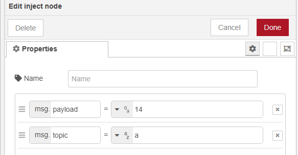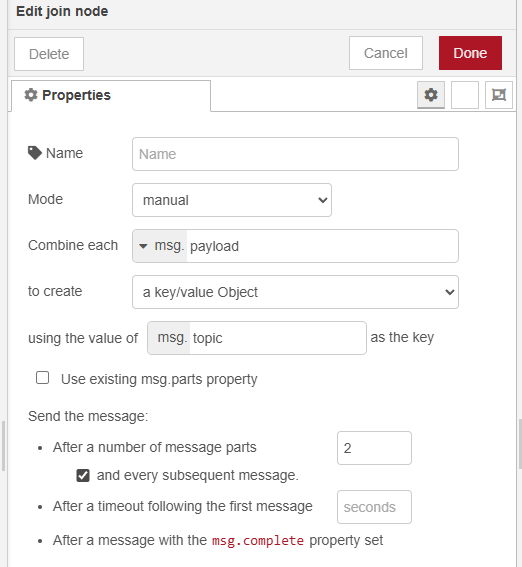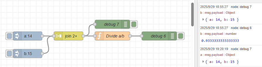 [{"id":"c14cca7a6b3692c4","type":"inject","z":"41ad2b666875c180","name":"","props":[{"p":"payload"},{"p":"topic","vt":"str"}],"repeat":"","crontab":"","once":false,"onceDelay":0.1,"topic":"a","payload":"14","payloadType":"num","x":2330,"y":340,"wires":[["5c9dd685597d2255"]]},{"id":"91c990cdec406220","type":"inject","z":"41ad2b666875c180","name":"","props":[{"p":"payload"},{"p":"topic","vt":"str"}],"repeat":"","crontab":"","once":false,"onceDelay":0.1,"topic":"b","payload":"15","payloadType":"num","x":2330,"y":400,"wires":[["5c9dd685597d2255"]]},{"id":"606146c6d71e76b0","type":"debug","z":"41ad2b666875c180","name":"debug 6","active":true,"tosidebar":true,"console":false,"tostatus":false,"complete":"false","statusVal":"","statusType":"auto","x":2780,"y":340,"wires":[]},{"id":"df0850302095ab30","type":"function","z":"41ad2b666875c180","name":"Divide a/b","func":"msg.payload = msg.payload.a / msg.payload.b;\nreturn msg;","outputs":1,"timeout":0,"noerr":0,"initialize":"","finalize":"","libs":[],"x":2620,"y":340,"wires":[["606146c6d71e76b0"]]},{"id":"7ce2a1550d7e61a2","type":"debug","z":"41ad2b666875c180","name":"debug 7","active":true,"tosidebar":true,"console":false,"tostatus":false,"complete":"false","statusVal":"","statusType":"auto","x":2620,"y":300,"wires":[]},{"id":"5c9dd685597d2255","type":"join","z":"41ad2b666875c180","name":"","mode":"custom","build":"object","property":"payload","propertyType":"msg","key":"topic","joiner":"\\n","joinerType":"str","useparts":false,"accumulate":true,"timeout":"","count":"2","reduceRight":false,"reduceExp":"","reduceInit":"","reduceInitType":"","reduceFixup":"","x":2470,"y":340,"wires":[["df0850302095ab30","7ce2a1550d7e61a2"]]}]