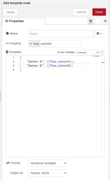 [{"id":"b17e05313f3ecb58","type":"change","z":"41ad2b666875c180","name":"","rules":[{"t":"set","p":"sensorA","pt":"flow","to":"payload","tot":"msg"}],"action":"","property":"","from":"","to":"","reg":false,"x":1580,"y":720,"wires":[[]]},{"id":"02a256a04c16dfaf","type":"inject","z":"41ad2b666875c180","name":"","props":[{"p":"payload"}],"repeat":"","crontab":"","once":true,"onceDelay":0.1,"topic":"","payload":"14","payloadType":"num","x":1410,"y":720,"wires":[["b17e05313f3ecb58"]]},{"id":"96719824dd37d600","type":"change","z":"41ad2b666875c180","name":"","rules":[{"t":"set","p":"sensorB","pt":"flow","to":"payload","tot":"msg"}],"action":"","property":"","from":"","to":"","reg":false,"x":1580,"y":760,"wires":[[]]},{"id":"16552d3e71c356be","type":"inject","z":"41ad2b666875c180","name":"","props":[{"p":"payload"}],"repeat":"","crontab":"","once":true,"onceDelay":0.1,"topic":"","payload":"2","payloadType":"num","x":1410,"y":760,"wires":[["96719824dd37d600"]]},{"id":"6feb7e52bd055d31","type":"template","z":"41ad2b666875c180","name":"","field":"payload","fieldType":"msg","format":"handlebars","syntax":"mustache","template":"{\n \"Sensor A\": {{flow.sensorA}},\n \"Sensor B\": {{flow.sensorB}}\n}","output":"json","x":1560,"y":820,"wires":[["f35135602422f184","67bfe78ed045f646","5ed2f073c0e84640"]]},{"id":"acc8094a45df4cf8","type":"inject","z":"41ad2b666875c180","name":"","props":[],"repeat":"","crontab":"","once":true,"onceDelay":0.1,"topic":"","x":1410,"y":820,"wires":[["6feb7e52bd055d31"]]},{"id":"f35135602422f184","type":"debug","z":"41ad2b666875c180","name":"debug 4","active":true,"tosidebar":true,"console":false,"tostatus":false,"complete":"false","statusVal":"","statusType":"auto","x":1720,"y":820,"wires":[]},{"id":"67bfe78ed045f646","type":"change","z":"41ad2b666875c180","name":"","rules":[{"t":"set","p":"payload","pt":"msg","to":"payload[\"Sensor A\"]","tot":"msg"}],"action":"","property":"","from":"","to":"","reg":false,"x":1740,"y":860,"wires":[["25dad2e4c3548d0d"]]},{"id":"5ed2f073c0e84640","type":"change","z":"41ad2b666875c180","name":"","rules":[{"t":"set","p":"payload","pt":"msg","to":"payload[\"Sensor B\"]","tot":"msg"}],"action":"","property":"","from":"","to":"","reg":false,"x":1740,"y":900,"wires":[["479b43c3bac73f40"]]},{"id":"25dad2e4c3548d0d","type":"ui_chart","z":"41ad2b666875c180","name":"","group":"879bd7fc7e4afe72","order":0,"width":0,"height":0,"label":"Sensor A","chartType":"line","legend":"false","xformat":"HH:mm:ss","interpolate":"linear","nodata":"","dot":false,"ymin":"","ymax":"","removeOlder":1,"removeOlderPoints":"","removeOlderUnit":"3600","cutout":0,"useOneColor":false,"useUTC":false,"colors":["#1f77b4","#aec7e8","#ff7f0e","#2ca02c","#98df8a","#d62728","#ff9896","#9467bd","#c5b0d5"],"outputs":1,"useDifferentColor":false,"className":"","x":1920,"y":860,"wires":[[]]},{"id":"479b43c3bac73f40","type":"ui_chart","z":"41ad2b666875c180","name":"","group":"879bd7fc7e4afe72","order":0,"width":0,"height":0,"label":"Sensor B","chartType":"line","legend":"false","xformat":"HH:mm:ss","interpolate":"linear","nodata":"","dot":false,"ymin":"","ymax":"","removeOlder":1,"removeOlderPoints":"","removeOlderUnit":"3600","cutout":0,"useOneColor":false,"useUTC":false,"colors":["#1f77b4","#aec7e8","#ff7f0e","#2ca02c","#98df8a","#d62728","#ff9896","#9467bd","#c5b0d5"],"outputs":1,"useDifferentColor":false,"className":"","x":1920,"y":900,"wires":[[]]},{"id":"879bd7fc7e4afe72","type":"ui_group","name":"Default","tab":"b1e7631a49932fee","order":1,"disp":true,"width":6,"collapse":false,"className":""},{"id":"b1e7631a49932fee","type":"ui_tab","name":"Home","icon":"dashboard","disabled":false,"hidden":false}]