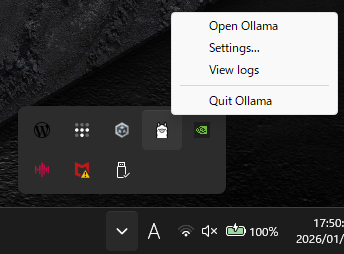 ▼タスクバーのラマを右クリックすると、Open Ollamaという選択肢があります。
