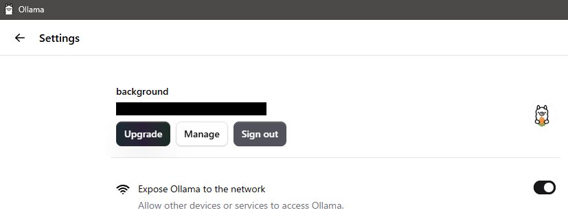 OllamaのGUI画面でネットワークに関する設定項目があったので、設定しておきました。