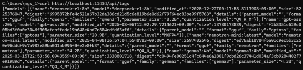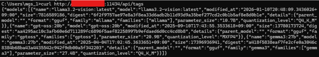 curl http://<IPアドレス>:11434/api/tags▼先程とは異なるモデルが表示されています。