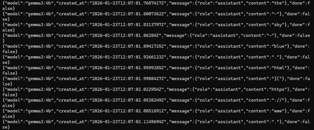 curl http://localhost:11434/api/chat -d "{\"model\": \"gemma3:4b\",\"messages\": [{\"role\": \"user\",\"content\": \"why is the sky blue?\"}]}"▼LM Studioのときにも似たようなことがあったのですが、単語ごとに出力されていました。
