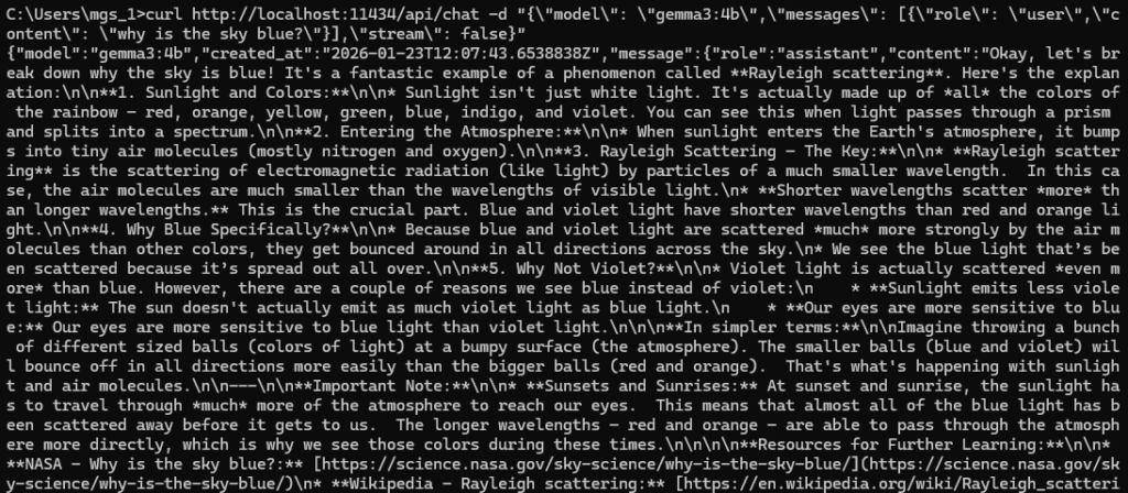 curl http://localhost:11434/api/chat -d "{\"model\": \"gemma3:4b\",\"messages\": [{\"role\": \"user\",\"content\": \"why is the sky blue?\"}],\"stream\": false}"▼処理が終わってから出力されました。