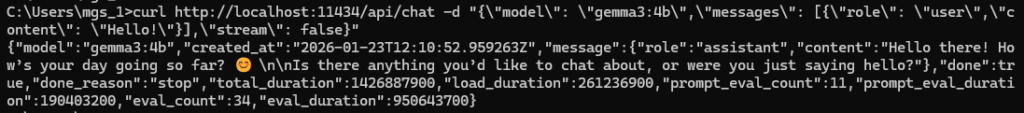 curl http://localhost:11434/api/chat -d "{\"model\": \"gemma3:4b\",\"messages\": [{\"role\": \"user\",\"content\": \"Hello! \"}],\"stream\": false}"▼3秒ぐらいで回答が返ってきました。