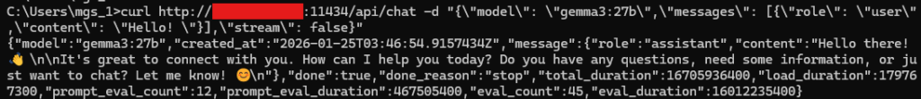 curl http://<IPアドレス>:11434/api/chat -d "{\"model\": \"gemma3:27b\",\"messages\": [{\"role\": \"user\",\"content\": \"Hello! \"}],\"stream\": false}"▼回答が返ってきました。