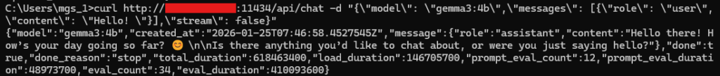 curl http://<IPアドレス>:11434/api/chat -d "{\"model\": \"gemma3:4b\",\"messages\": [{\"role\": \"user\",\"content\": \"Hello! \"}],\"stream\": false}"▼1秒ぐらいですぐに回答が返ってきました。