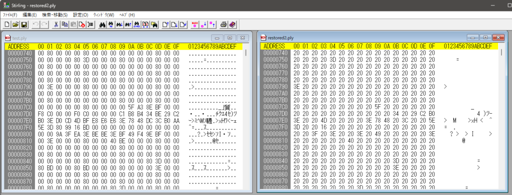 ▼Null文字がスペースになっていることがありました。2つのファイルの相違点を比較できます。
