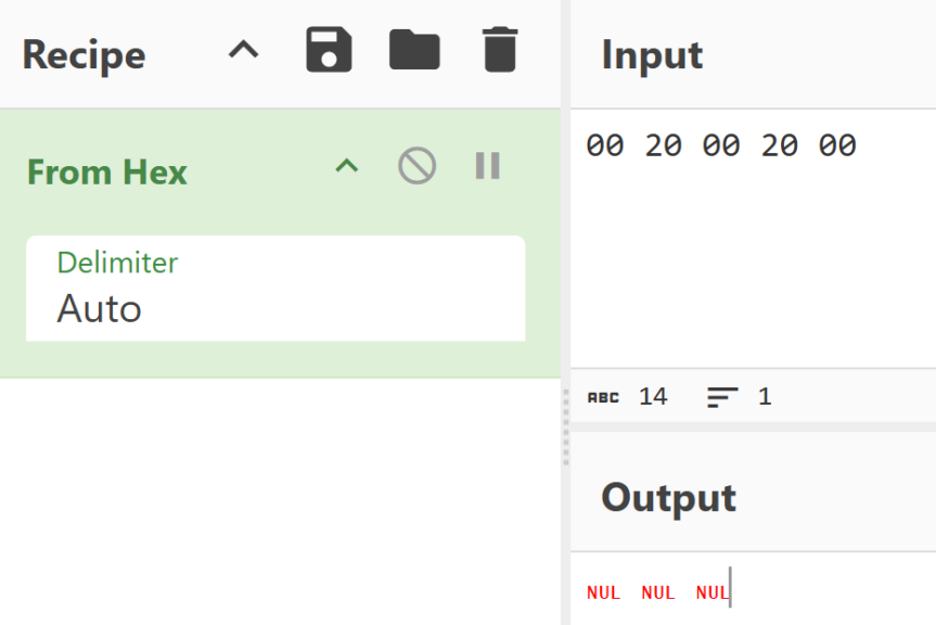 ▼16進数表記から変換すると、00はNull文字で、20はスペースです。