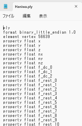 ▼例えばScaniverseでエクスポートしたplyファイルをメモ帳で開くと、変数名が並んでいます。