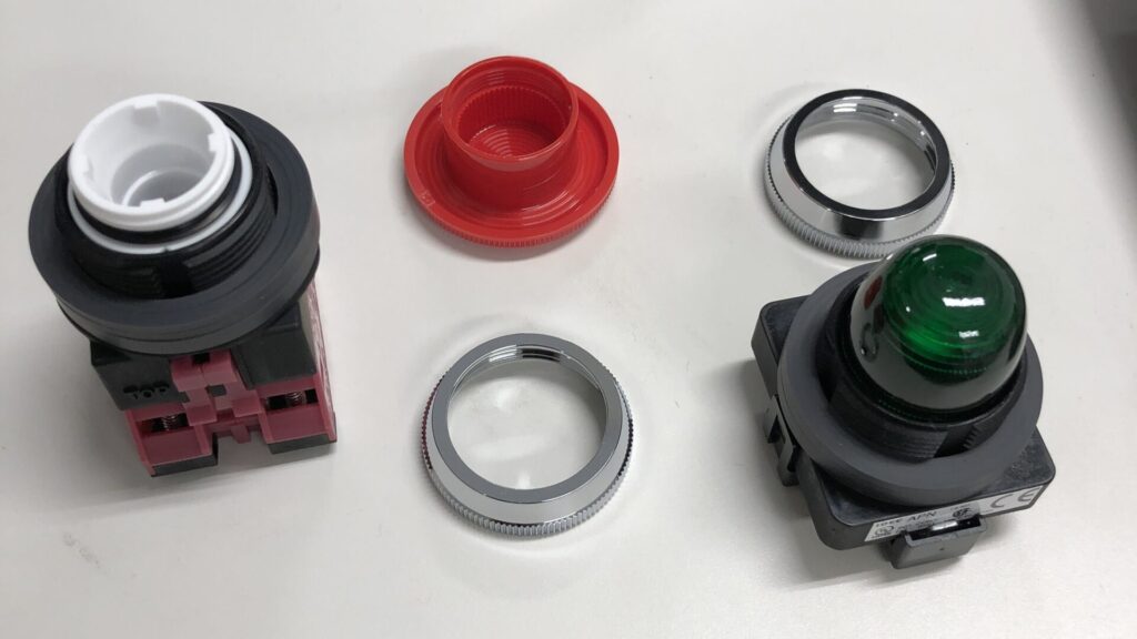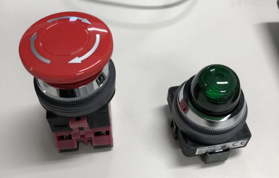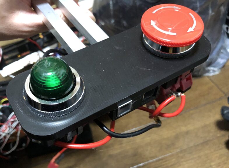 キャチロボのレギュレーションに則って、緊急停止スイッチと電源表示灯を取り付けました。