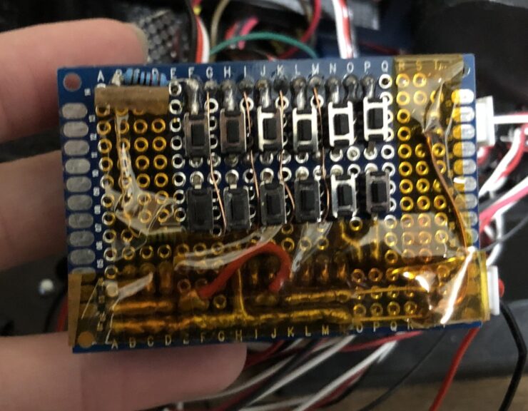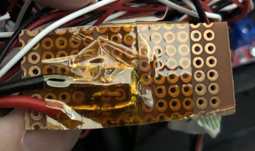 ちゃんと固定穴を設けた基板を設計して固定することが望ましいのですが、今回はユニバーサル基板で急いで製作して、詰め込んで入れていたので、しっかり絶縁しておきました。