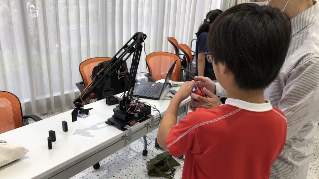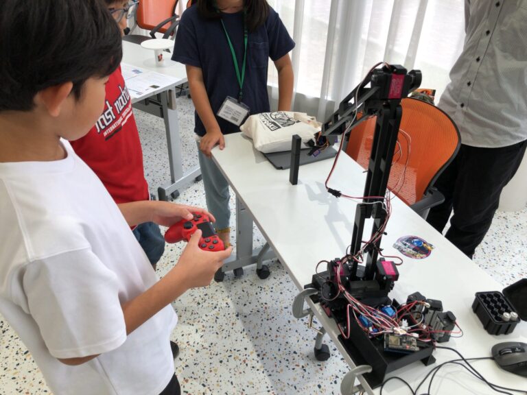 ▼実際にこんな感じで子どもたちに操縦を体験してもらっていました。(サーボモータがいくつか壊れたことはさておき...)