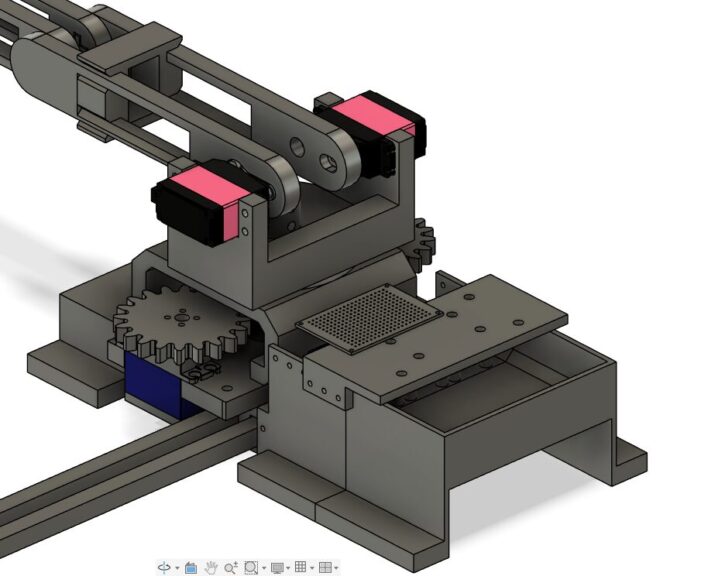 前回の記事の時点ではクランプで机に固定していたのですが、土台部分を作成しました。2つのサーボモータで3Dプリンター製の歯車を回転させ、1つの軸を回転させました。