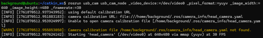 rosrun usb_cam usb_cam_node _video_device:=/dev/video0 _pixel_format:=yuyv _image_width:=640 _image_height:=480 _framerate:=30▼問題なく起動できたようです。