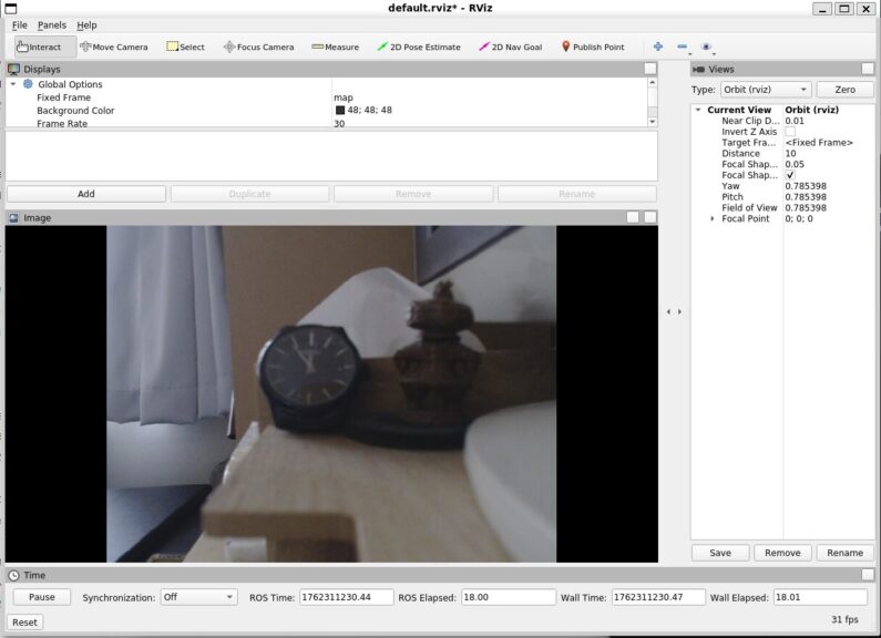 rosrun usb_cam usb_cam_node _video_device:=/dev/video0 _pixel_format:=yuyv _image_width:=640 _image_height:=480 _framerate:=30自宅のJetson XavierにUSBカメラを接続し、電波時計を置いて大学からRVizで確認してみました。