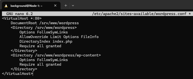 curl https://wordpress.org/latest.tar.gz | sudo -u www-data tar zx -C /srv/wwwsudo nano /etc/apache2/sites-available/wordpress.conf を実行し、以下の内容を記述しました。
