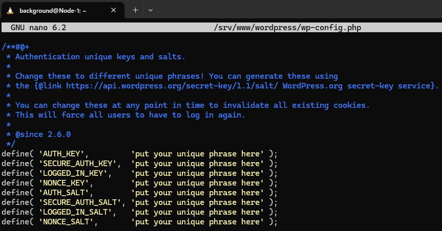 sudo -u www-data nano /srv/www/wordpress/wp-config.php▼シークレットキー関連の部分がput your unique phrase hereとなっていました。