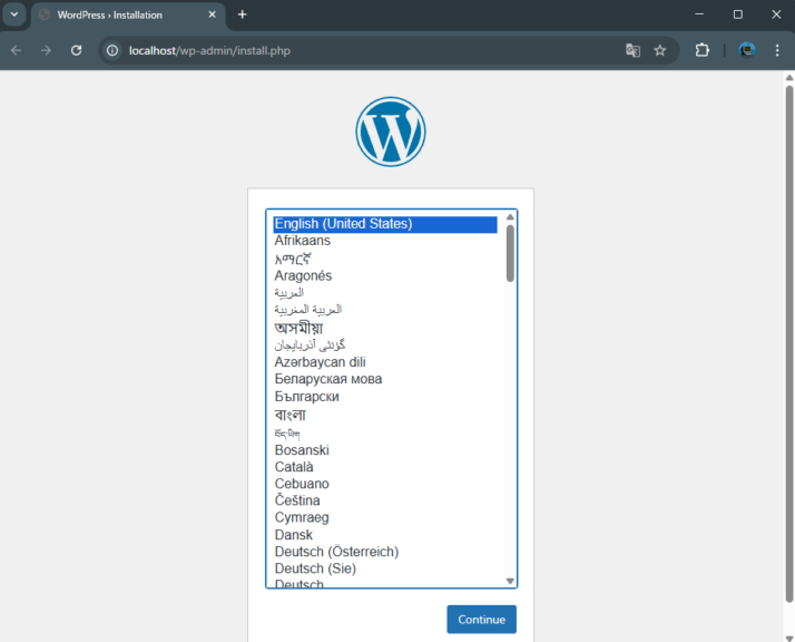 この状態でhttp://localhostにアクセスすると、WordPressの画面が起動しました。