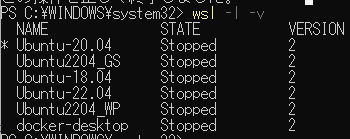 wsl --import Ubuntu2204_WP "W:\Ubuntu2204_WP" "C:\Users\mgs_1\Downloads\ubuntu-jammy-wsl-amd64-ubuntu22.04lts.rootfs.tar.gz"▼Ubuntu2204_WPが追加されました。