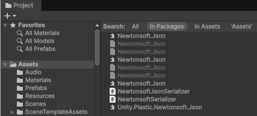 ▼Projectの検索欄でIn PackageのNewtonsoft.Jsonを検索すると、複数あります。